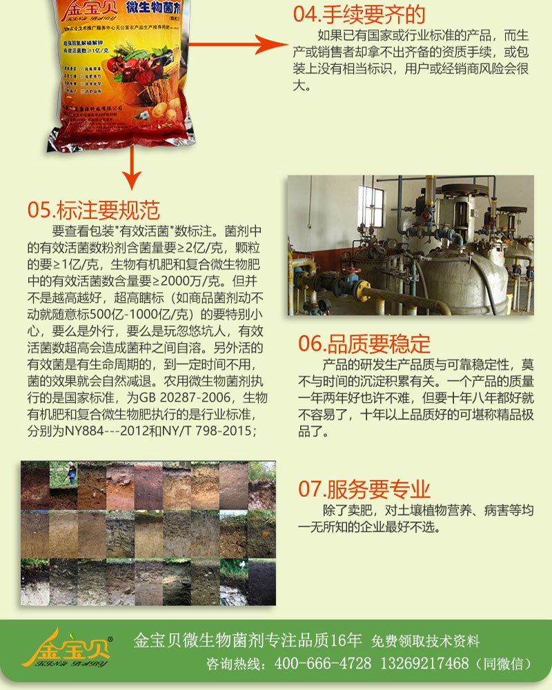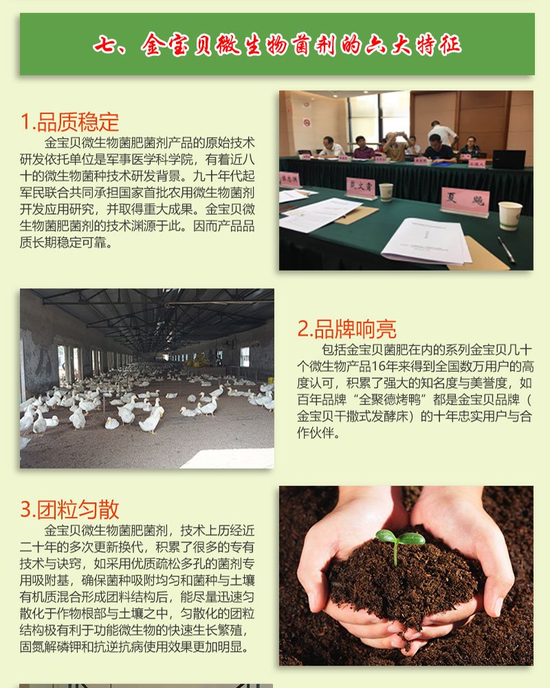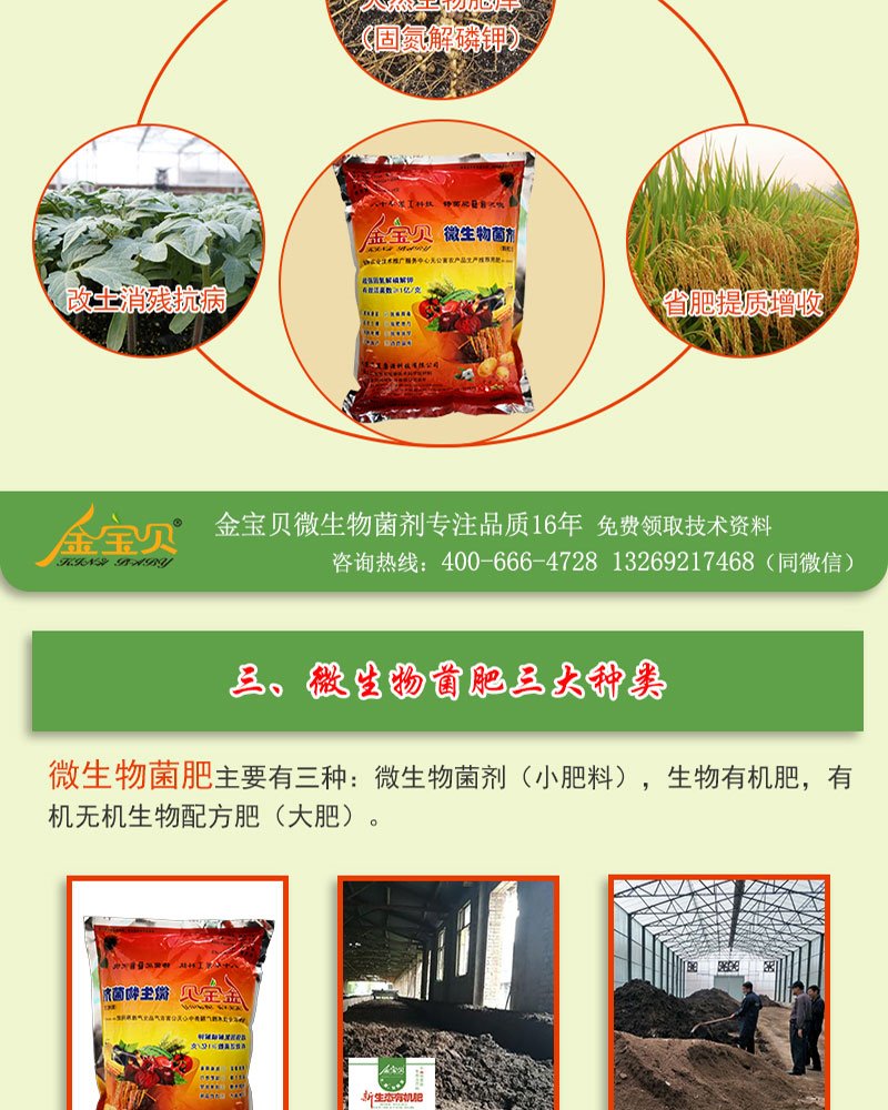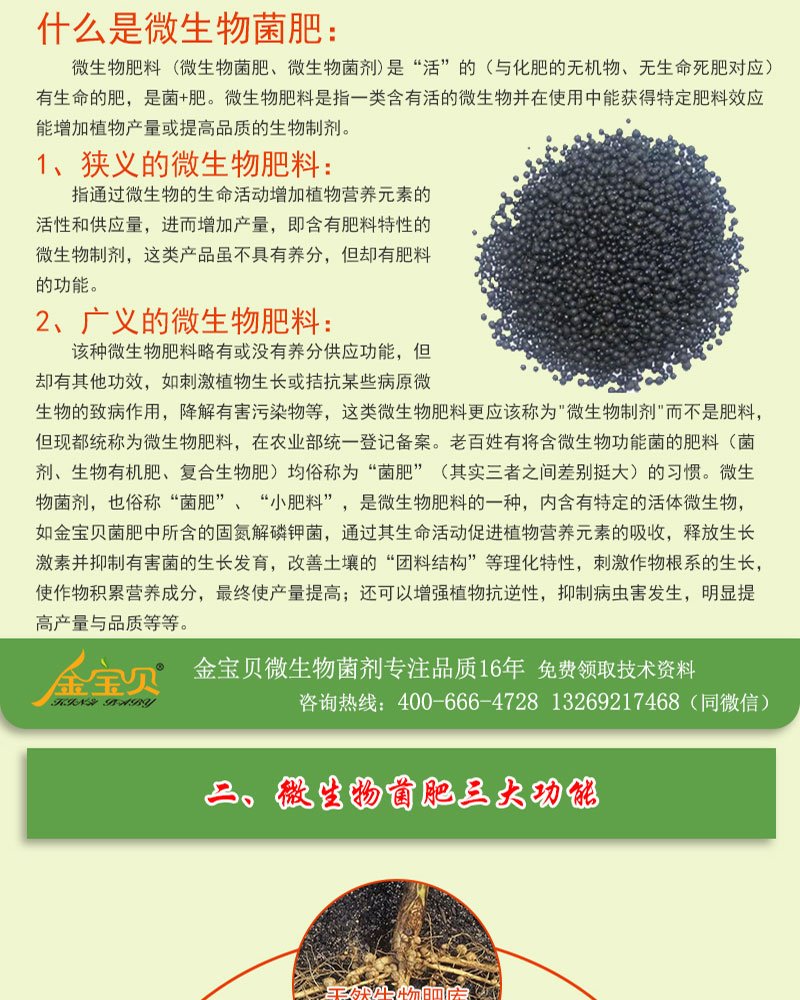 金宝贝微生物菌肥是根据植物营养生理学和根际土壤微生态学原理,由军科院、农科院研发,北京华夏康源科技有限公司自主投资开发策划并组织全国市场营销的第五代高新科技产品。正确施用本品,能使经济作物增产10%--30%,大田作物增产10%左右,降低化肥用量、降低生产成本、改良土壤结构、消除土壤板结、改善作物品质、提高商品率,终显著提高经济效益,是绿色食品理想的生产资料。第一代老产品曾于1997年首批获农业部微生物肥料登记证,早在1994年就获得全国"两高一优"农业新技术金奖、1996年中国杨陵农业科技博览会金奖、以及后来的系列大奖,经全国二十几个省市 自治区十多年推广应用,效果显著,深受广大用户欢迎,是国内微生物菌肥、生物肥领域的太师级产品(微生物工程技术研发始于1937),是军工技术农用的成功杰作。有效功能活菌数远高于国标,尤其是产品外观有重大突破,包装更可爱、更人性化,因而更好卖、更好用,更符合市场需求。