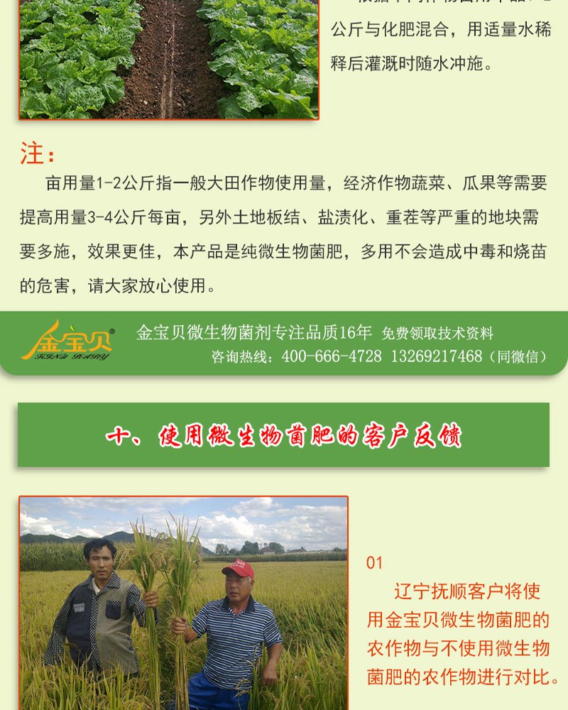 注:亩用量1-2公斤指一般大田作物使用量,经济作物蔬菜、瓜果等需要提高用量3-4公斤每亩,另外土地板结、盐渍化、重茬等严重的地块需要多施,效果更佳,本产品是纯微生物菌肥,多用不会造成中毒和烧苗的危害,请大家放心使用。