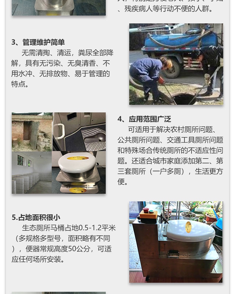 4、应用范围广,可适用于解决农村厕所问题、公共厕所问题、交通工具厕所问题和特殊场合传统厕所的不适应性问题。