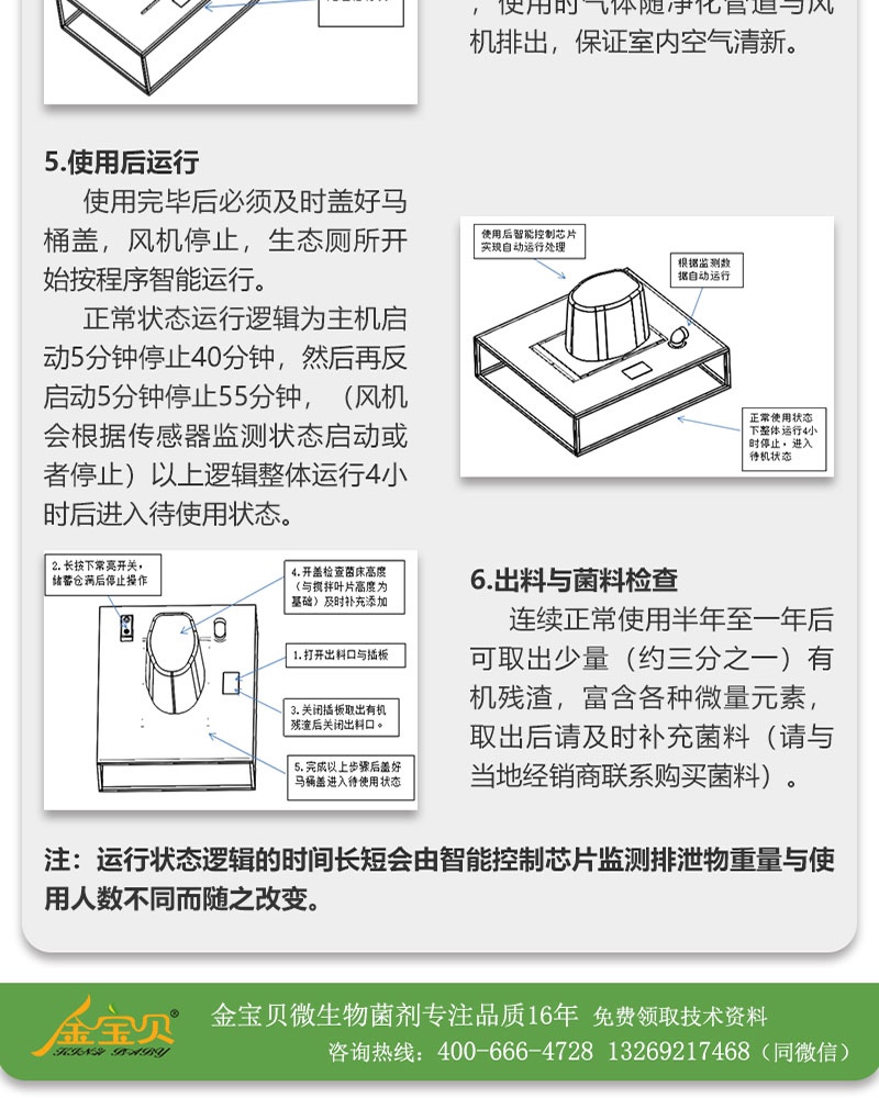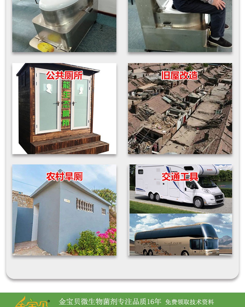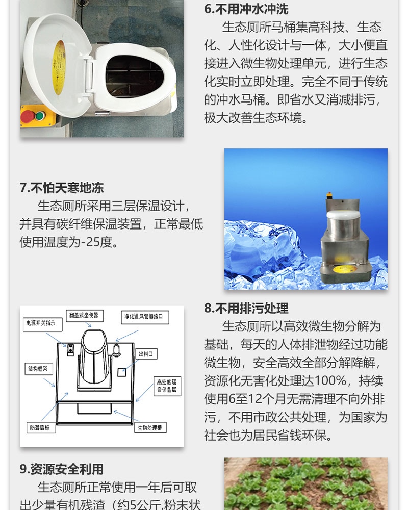 3、无需清掏、清运,降解率为99%,具有无污染、无臭清香、不用水冲、无排放物、易于管理的特点。