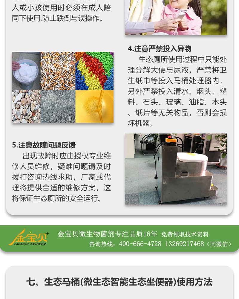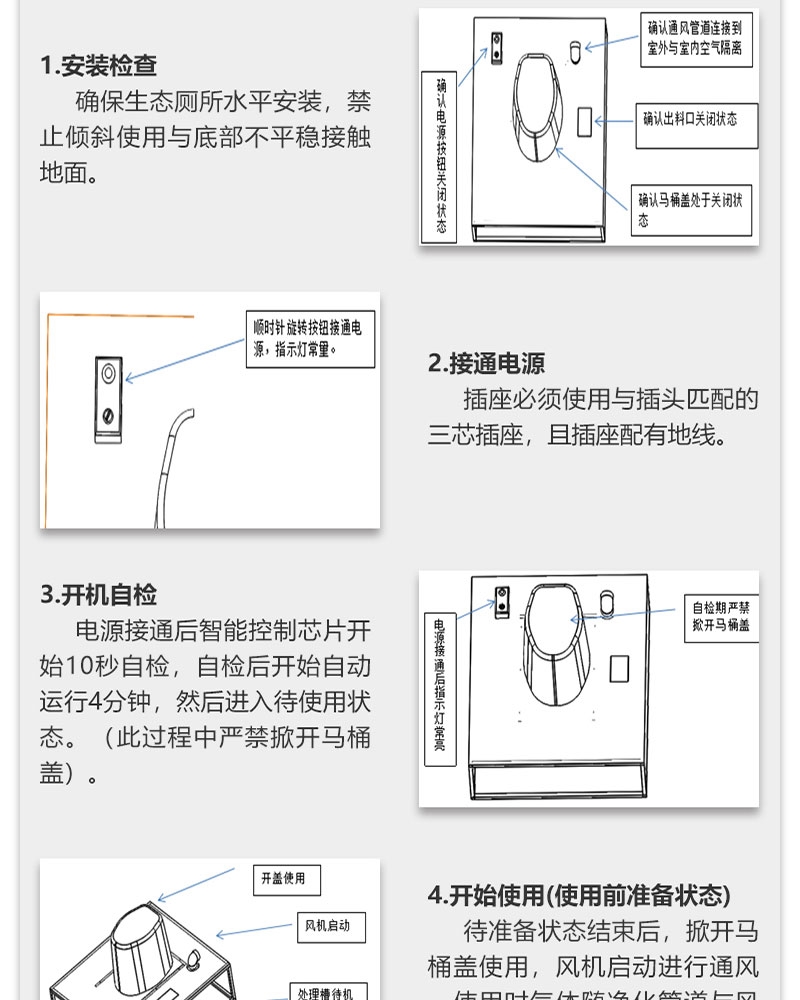 使用时注意生态厕所马桶锐角等尖锐部分,以免刮伤,老人或小孩使用时必须在成人陪同下使用,防止跌倒与误操作。