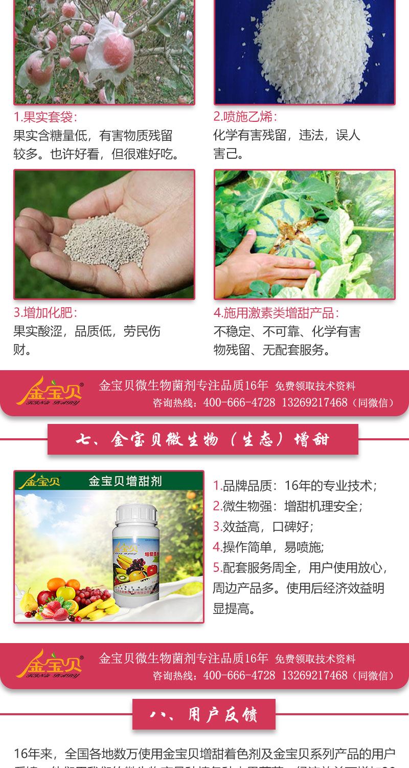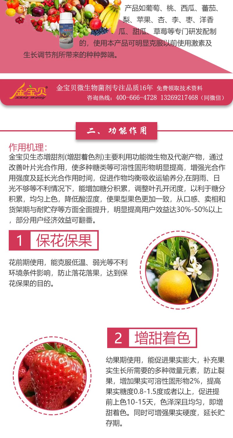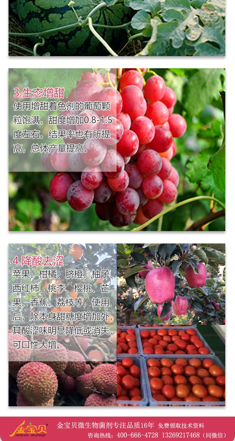 桃李瓜果不甜,少卖一半钱!种瓜人又羞又急!本品是日本高端微生物工程技术新产品, 依靠微生物改善光合作用增糖增甜,无激素,超环保安全。西瓜、葡萄、草霉、苹果、西红柿、甜瓜、枣等几十种果蔬均可,效果奇特。特征:活性因子+单糖+微肥+稀土。本品是应用日本新生物工程技术,针对外观及内在品质要求较高的一些果蔬产品如葡萄、桃、西瓜、蕃茄、梨、苹果、杏、李、枣、洋香瓜、甜瓜、草莓等专门研发配制的,使用本产品可明显克服以前使用激素及生长调节剂所带来的种种弊端。