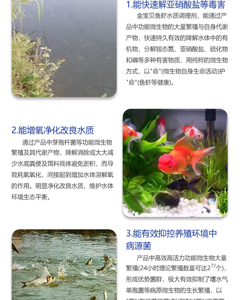 1、能快速降解有机物与有害物质。金宝贝鱼虾水质调理剂,能通过产品中功能微生物的大量繁殖与代谢产物,快速有效地降解水体中的有机物,分解铵态氮、亚硝酸盐、硫化物和磷等多种有害物质,用纯粹的微生物方式,以"命"(微生物自身生命活动)护"命"(鱼虾等健康)。