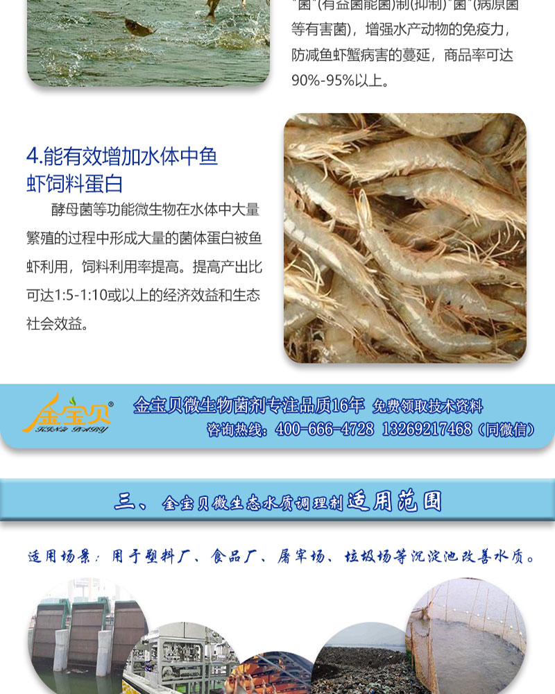 金宝贝鱼虾水产水质调理剂,是一种专用于鱼虾等多种水产动物的水质保护调理活菌剂,能有效抑制水产动物病原菌的繁殖,增强动物的抗病力,维护水体生态平衡,预防"翻塘"、"浮头",大大降低死亡率。本品是采用美日韩国际微生物工程技术成果,经分离、筛选、诱变、提纯、复壮等一系列高科技手段而获得的高性能菌株,再与其他特效物质经精工复配而成,内含高性能芽孢杆菌类微生物(有效活菌数在每克20亿以上)、天然螯合物等多种益生物质,是一种纯天然、绿色的微生物制品,是抗生素的理想替代品,能有效提高水产品的产量、品质,饲料报酬率与经济效益。