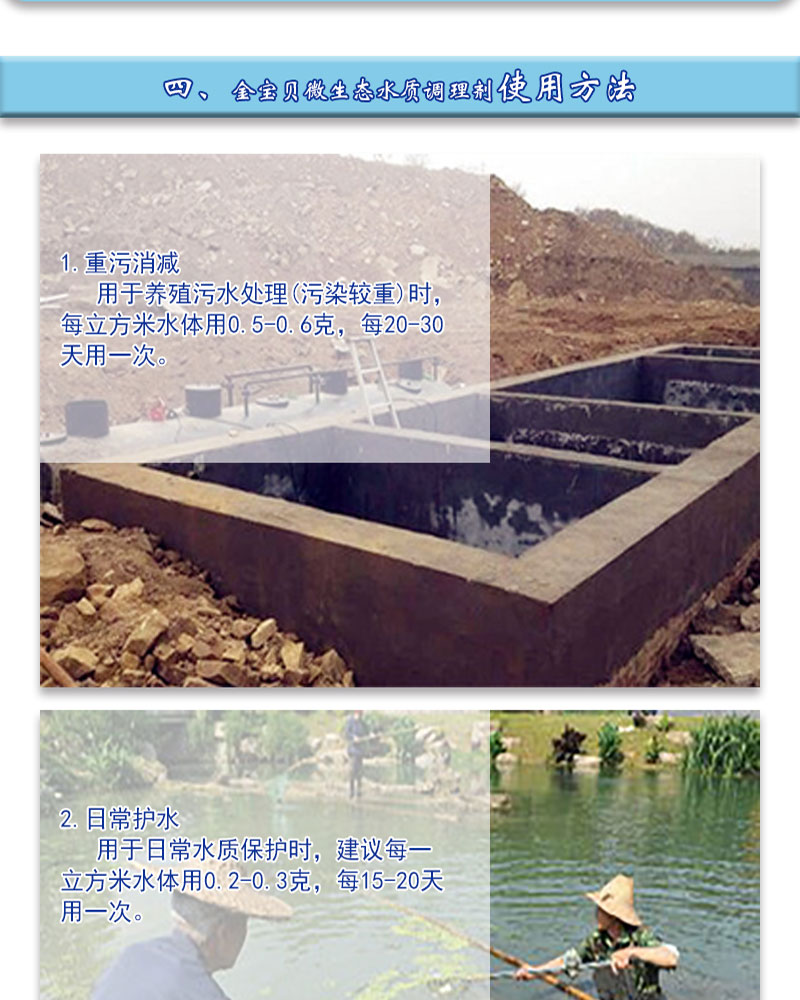 1、用量:用于养殖污水处理(污染较重)时:每立方米水体用0.5-0.6克,每20-30天用一次;用于日常水质保护时,建议每一立方米水体用0.2-0.3克,每15-20天用一次。如遇水体污染较严重、水源紧张、温室养殖或低温季节换水困难等情况下,可适当加大用量,以延长换水期。如使用量增加到每立方米水体用金宝贝水质调理剂0.5克时,可将换水期延长到一个月以上。