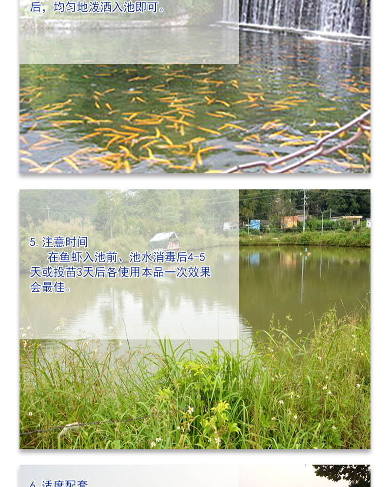 3、间隔:在鱼虾入池前、池水消毒后4-5天或投苗3天后各使用本品一次效果会更佳。