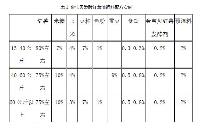 2.薯渣发酵过程中,也可和蛋白饲料(指豆粕、花生粕、葵花籽饼粕、芝麻饼粕、棉粕、菜粕、鱼粉、肉骨粉、血粉,或豆渣、啤酒糟等),并添加预混料一起发酵,使发酵后的薯渣的能量蛋白比较平衡,比较齐全。在喂养动物的时候直接替代部分全价饲料即可。以养猪为例,华夏康源公司给出的参考饲料配方如下表1。