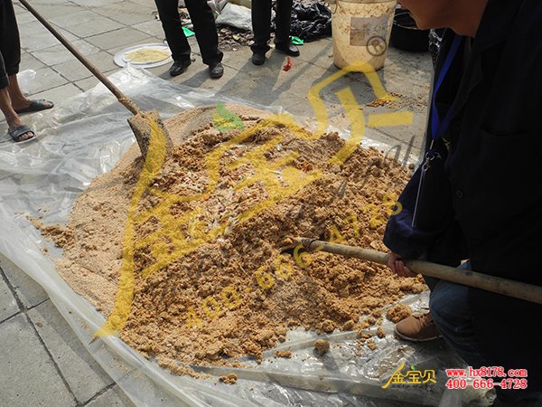 先将发霉饲料粉碎成碎粒状,放在容器中参加3~4倍的卫生水后进行拌和,让其浸泡,每天换1次清水拌和2次,直到浸泡的水由茶色变为清亮无色停止。适用于籽实谷类饲料。