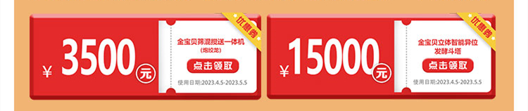 5、购买金宝贝发酵床类客户产品实付款满10000元以上时,在享受以上优惠同时。再赠送金宝贝新型筛混搅送一体机3500元代金券和金宝贝异位发酵斗塔设备代15000元代金券,该券仅适用于购买金宝贝设备类产品专项使用。设备代金券一年内有效。活动截止日期:2023年5月5日