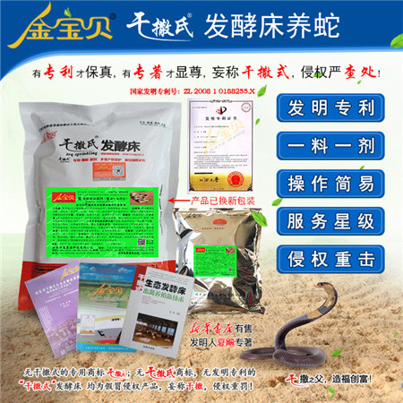 3、菌种准备: (1)用量:金宝贝发酵剂1公斤,可以铺建15~25平方的蛇圈,养殖密度不能过高(密度与蛇的体重品种有关,详情可来电咨询);(2)稀释:金宝贝发酵助剂必须与米糠(或玉米粉),按菌剂:米糠(或玉米粉)=1:5以上的比例均匀混合稀释(新鲜米糠的营养效果优于陈旧米糠)。