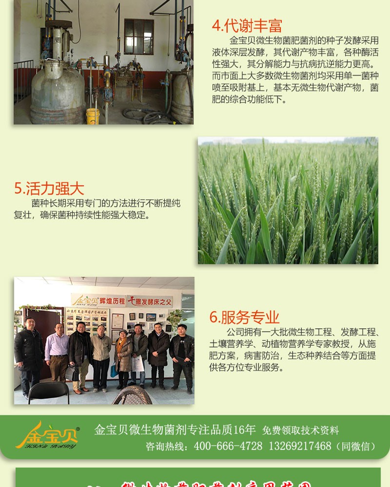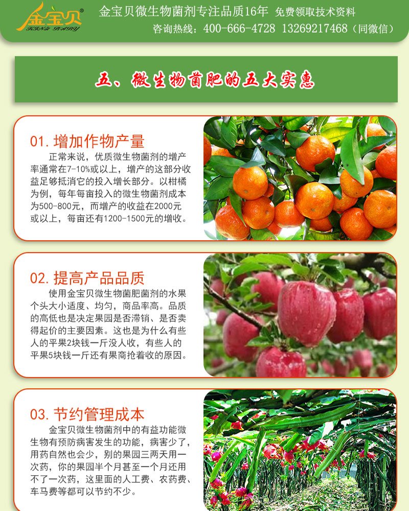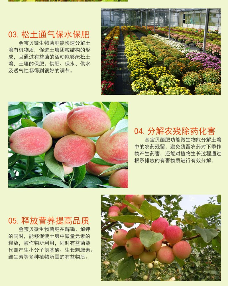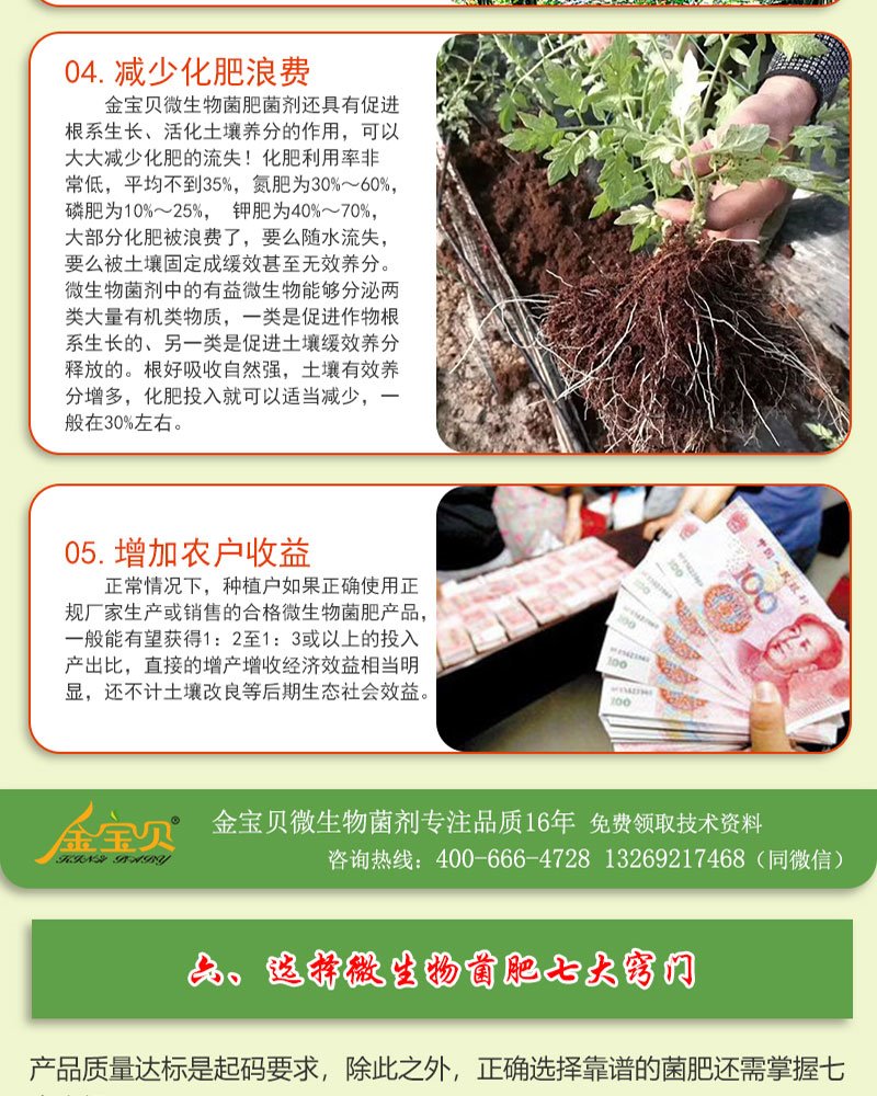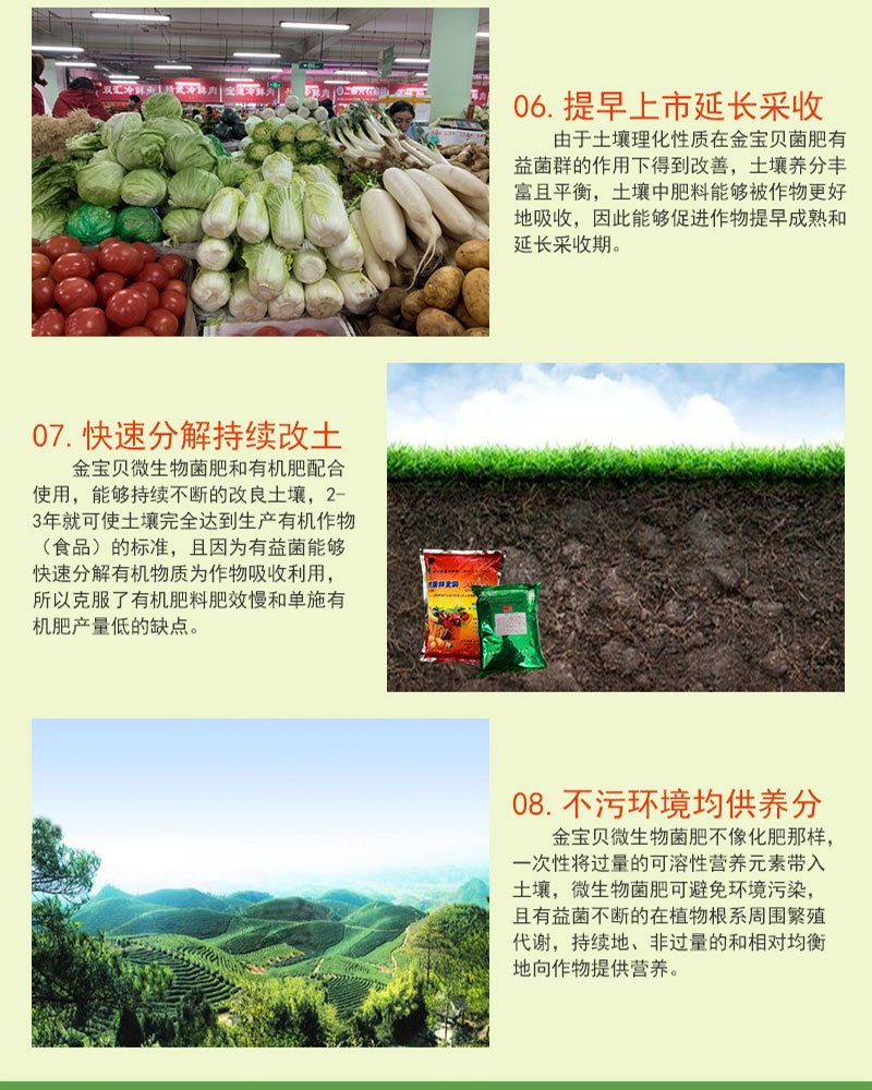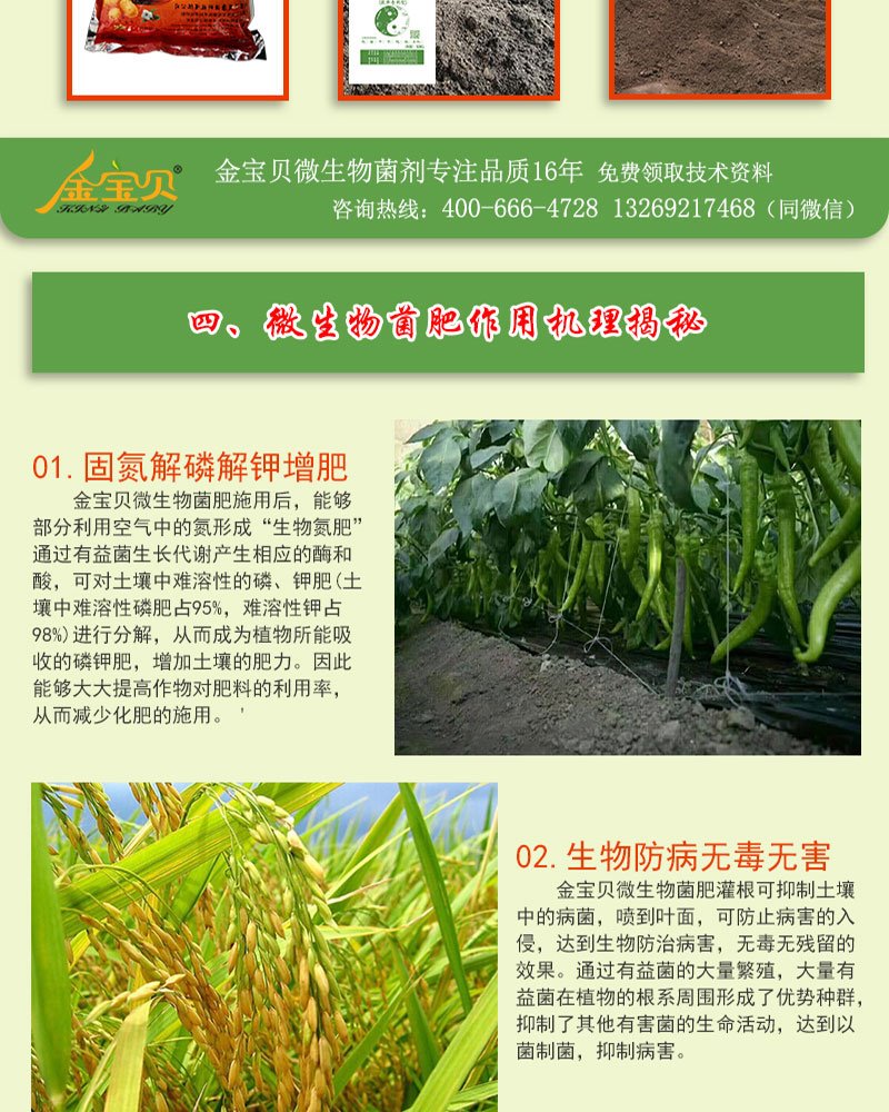 金宝贝微生物菌肥是根据植物营养生理学和根际土壤微生态学原理,由军科院、农科院研发,北京华夏康源科技有限公司自主投资开发策划并组织全国市场营销的第五代高新科技产品。正确施用本品,能使经济作物增产10%--30%,大田作物增产10%左右,降低化肥用量、降低生产成本、改良土壤结构、消除土壤板结、改善作物品质、提高商品率,终显著提高经济效益,是绿色食品理想的生产资料。第一代老产品曾于1997年首批获农业部微生物肥料登记证,早在1994年就获得全国"两高一优"农业新技术金奖、1996年中国杨陵农业科技博览会金奖、以及后来的系列大奖,经全国二十几个省市 自治区十多年推广应用,效果显著,深受广大用户欢迎,是国内微生物菌肥、生物肥领域的太师级产品(微生物工程技术研发始于1937),是军工技术农用的成功杰作。有效功能活菌数远高于国标,尤其是产品外观有重大突破,包装更可爱、更人性化,因而更好卖、更好用,更符合市场需求。