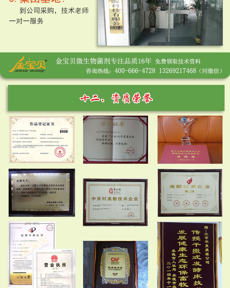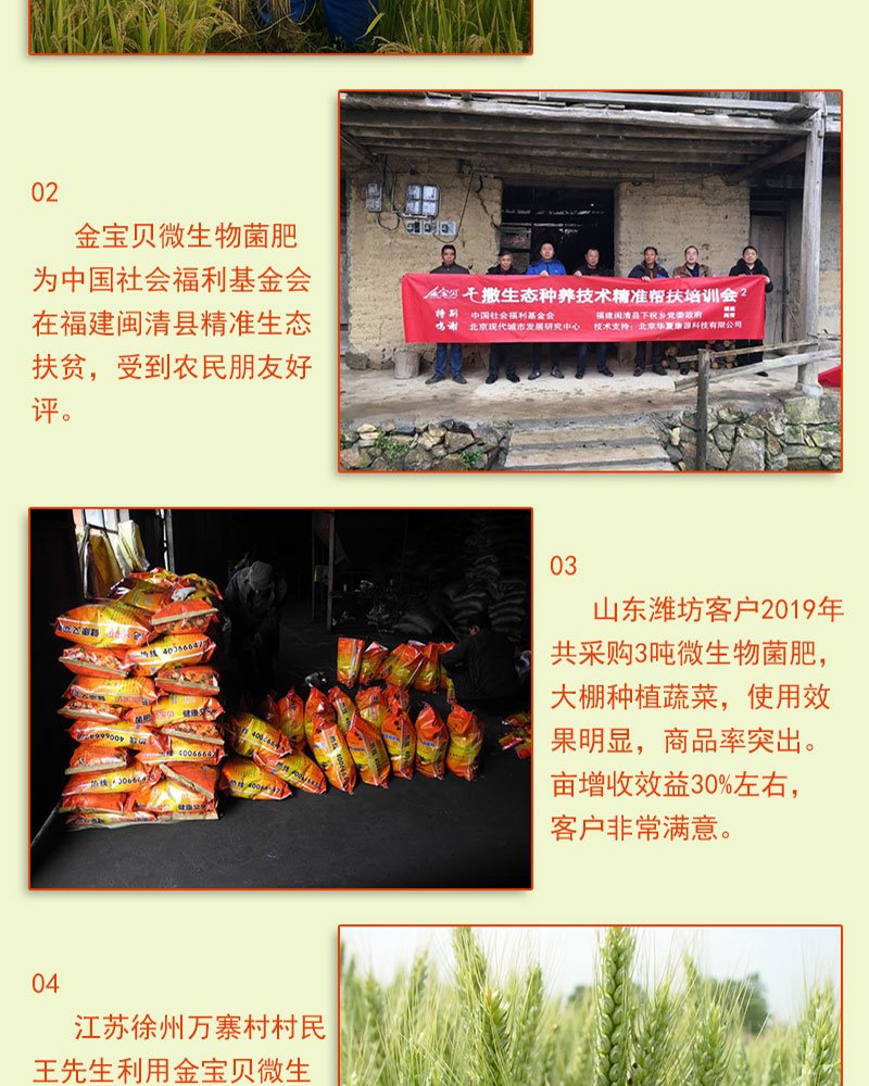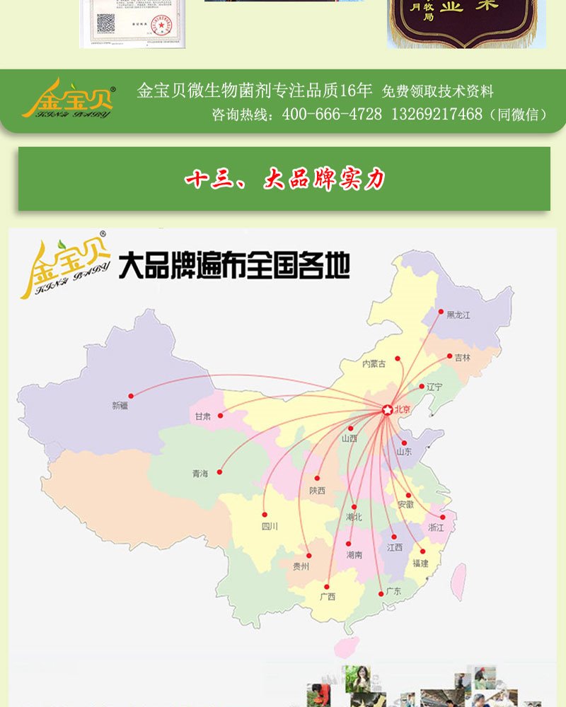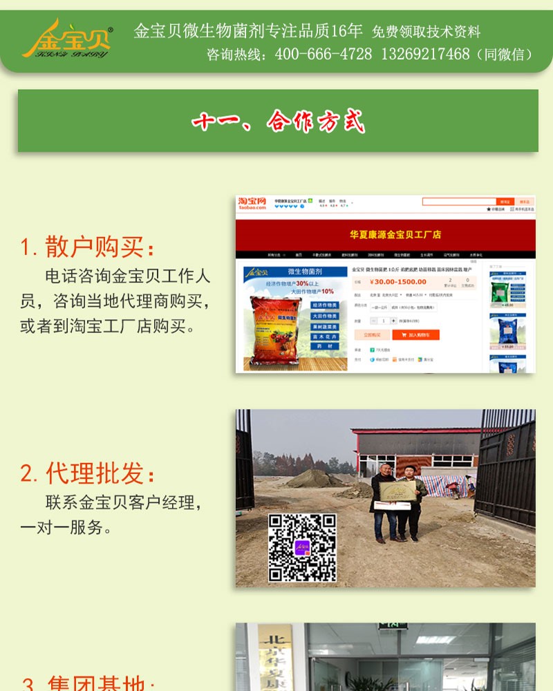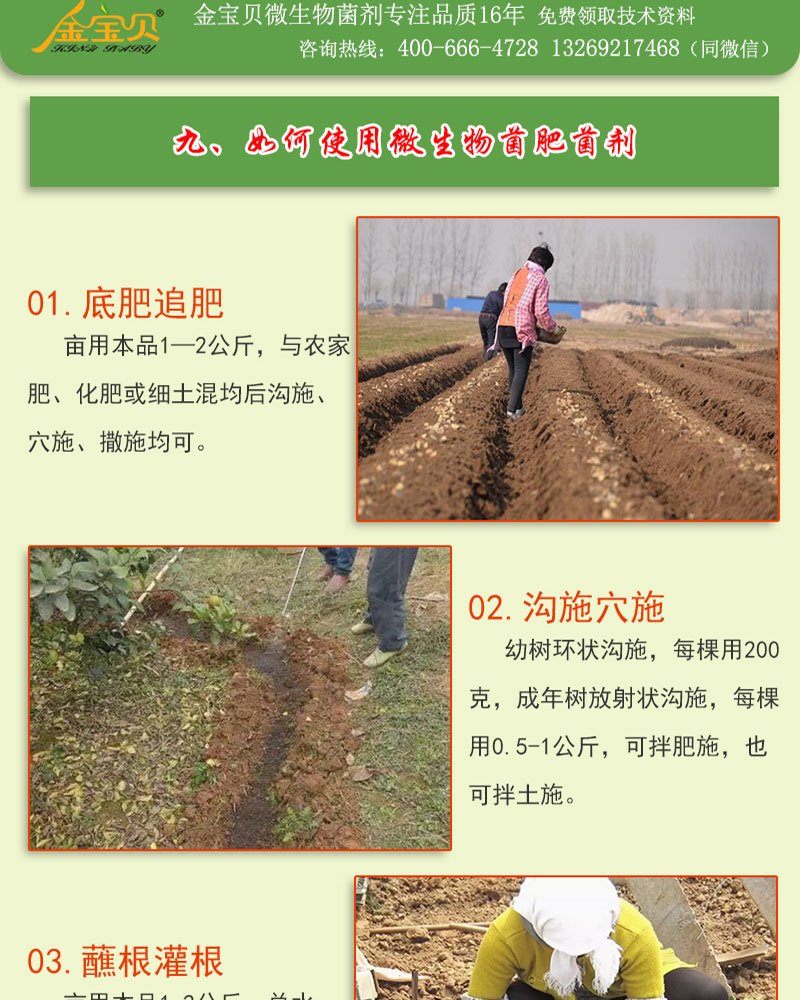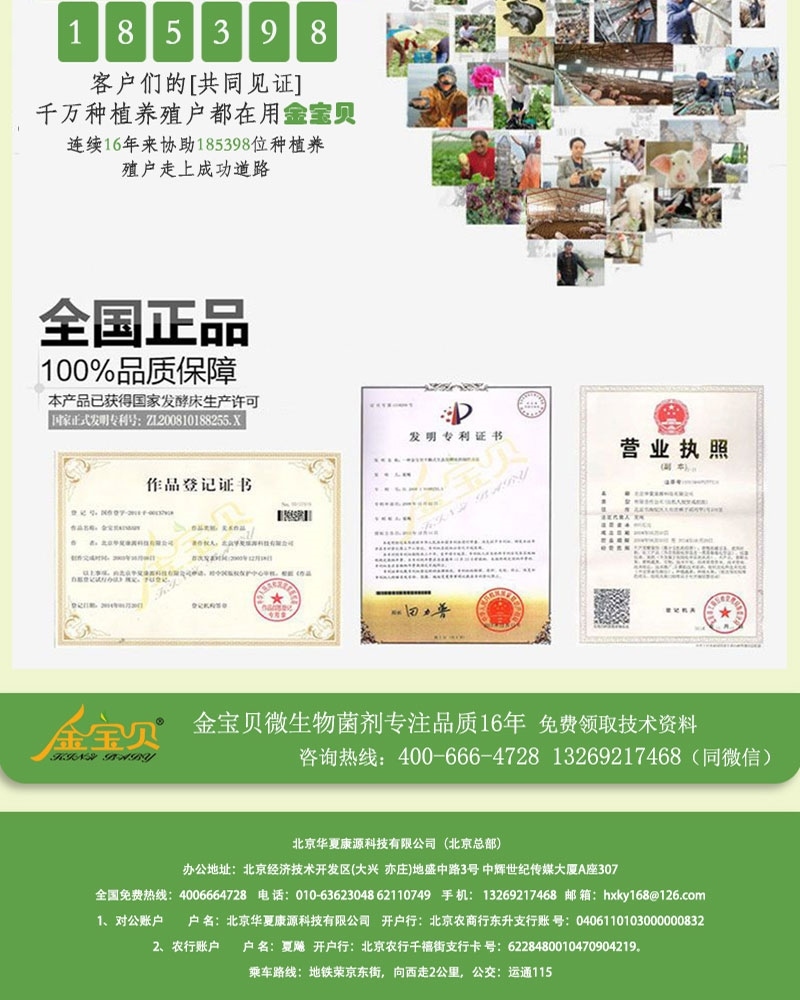 金宝贝微生物菌肥是根据植物营养生理学和根际土壤微生态学原理,由军科院、农科院研发,北京华夏康源科技有限公司自主投资开发策划并组织全国市场营销的第五代高新科技产品。正确施用本品,能使经济作物增产10%--30%,大田作物增产10%左右,降低化肥用量、降低生产成本、改良土壤结构、消除土壤板结、改善作物品质、提高商品率,终显著提高经济效益,是绿色食品理想的生产资料。第一代老产品曾于1997年首批获农业部微生物肥料登记证,早在1994年就获得全国"两高一优"农业新技术金奖、1996年中国杨陵农业科技博览会金奖、以及后来的系列大奖,经全国二十几个省市 自治区十多年推广应用,效果显著,深受广大用户欢迎,是国内微生物菌肥、生物肥领域的太师级产品(微生物工程技术研发始于1937),是军工技术农用的成功杰作。有效功能活菌数远高于国标,尤其是产品外观有重大突破,包装更可爱、更人性化,因而更好卖、更好用,更符合市场需求。