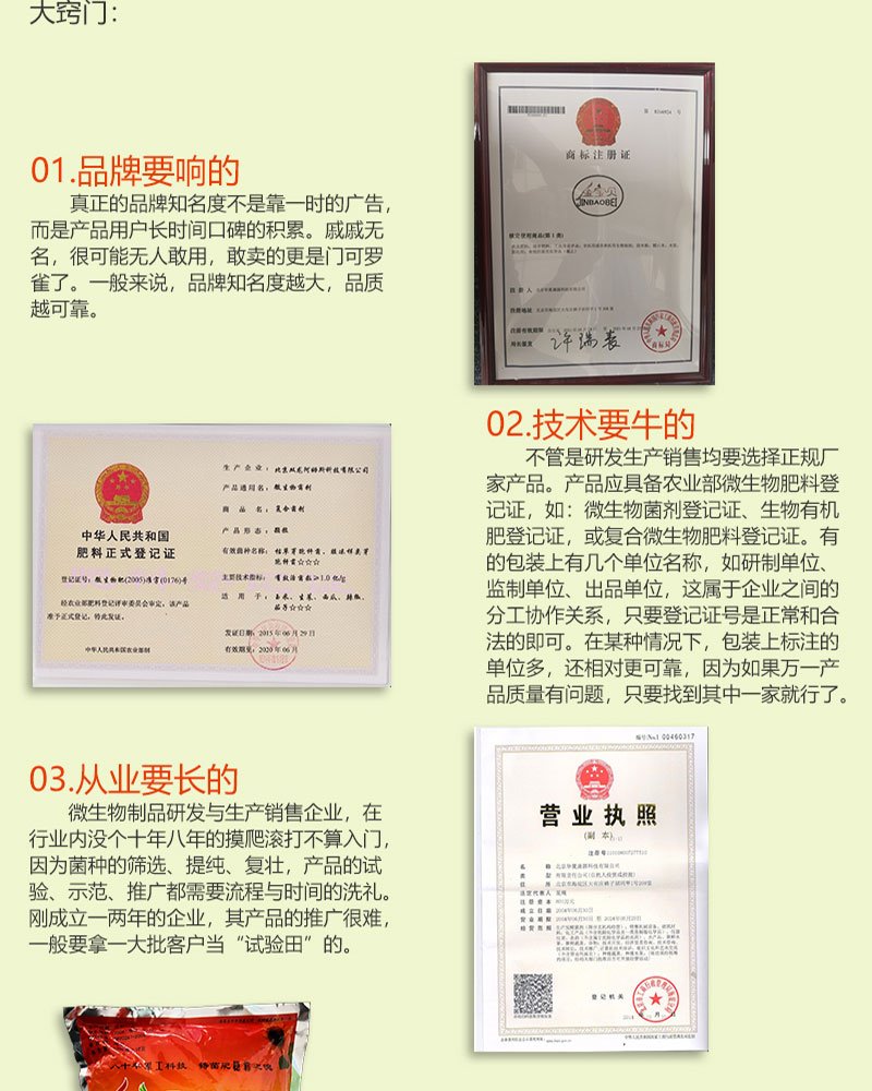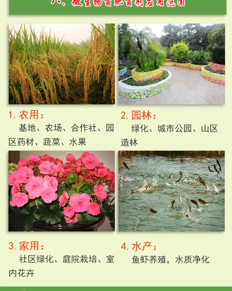 注:亩用量1-2公斤指一般大田作物使用量,经济作物蔬菜、瓜果等需要提高用量3-4公斤每亩,另外土地板结、盐渍化、重茬等严重的地块需要多施,效果更佳,本产品是纯微生物菌肥,多用不会造成中毒和烧苗的危害,请大家放心使用。