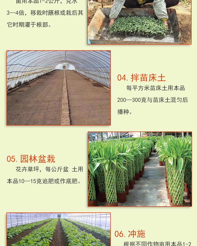 (6)冲施:根据不同作物亩用本品1-2公斤与化肥混合,用适量水稀释后灌溉时随水冲施。