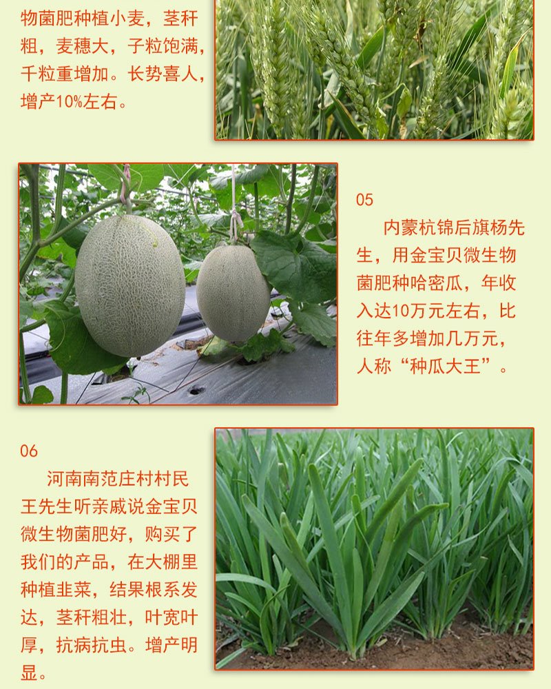 临河市曙光乡红光三社--蔡先生:施过金宝贝生物肥的瓜,病害少、畸形瓜少、绿色期延长、花期长、果实膨大快、采集期长。我使用金宝贝都上了瘾。我的使用方法是:少吃多餐。即,在总量不变的情况下,每次用浇水洒胡椒面的方式,每次用一点金宝贝,结果黄瓜和西红柿的采摘期明显延长,过去每2—3天采摘一次,自从用了金宝贝后,每天就可以采摘一次。而且黄瓜直,西红柿光泽度好,打药次数明显减少,既省工又节省开支,上市还能卖个好价钱。后来,弟兄们看到我用了金宝贝效益很好,纷纷都来取经。秋天,弟兄们在菜地里的葱、蒜、土豆、玉米等作物上都施用了金宝贝生物肥,效果非常好。