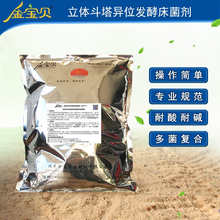 金宝贝异位发酵床发酵剂(发酵菌剂)是综合吸收当今欧美日韩国际高端微生物工程技术与工艺流程之精华,传承本公司十六年独有自主知识产权——国家发明专利“金宝贝干撒发酵床技术”(国家发明专利号:200810188255.x)的核心技术,经高科技筛选、提纯、复壮、复配等工艺流程精工研制,由嗜热耐高温枯草芽孢杆菌、地衣厕孢酵母等多种细菌、放线菌、真菌功能微生物独特配伍而成,专门用于异位发酵床发酵处理多种有机废弃物的专业复合微生物发酵菌种剂。
