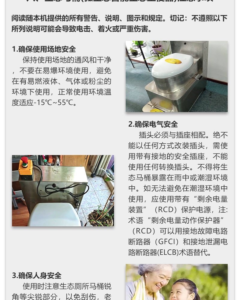 使用时注意生态厕所马桶锐角等尖锐部分,以免刮伤,老人或小孩使用时必须在成人陪同下使用,防止跌倒与误操作。
