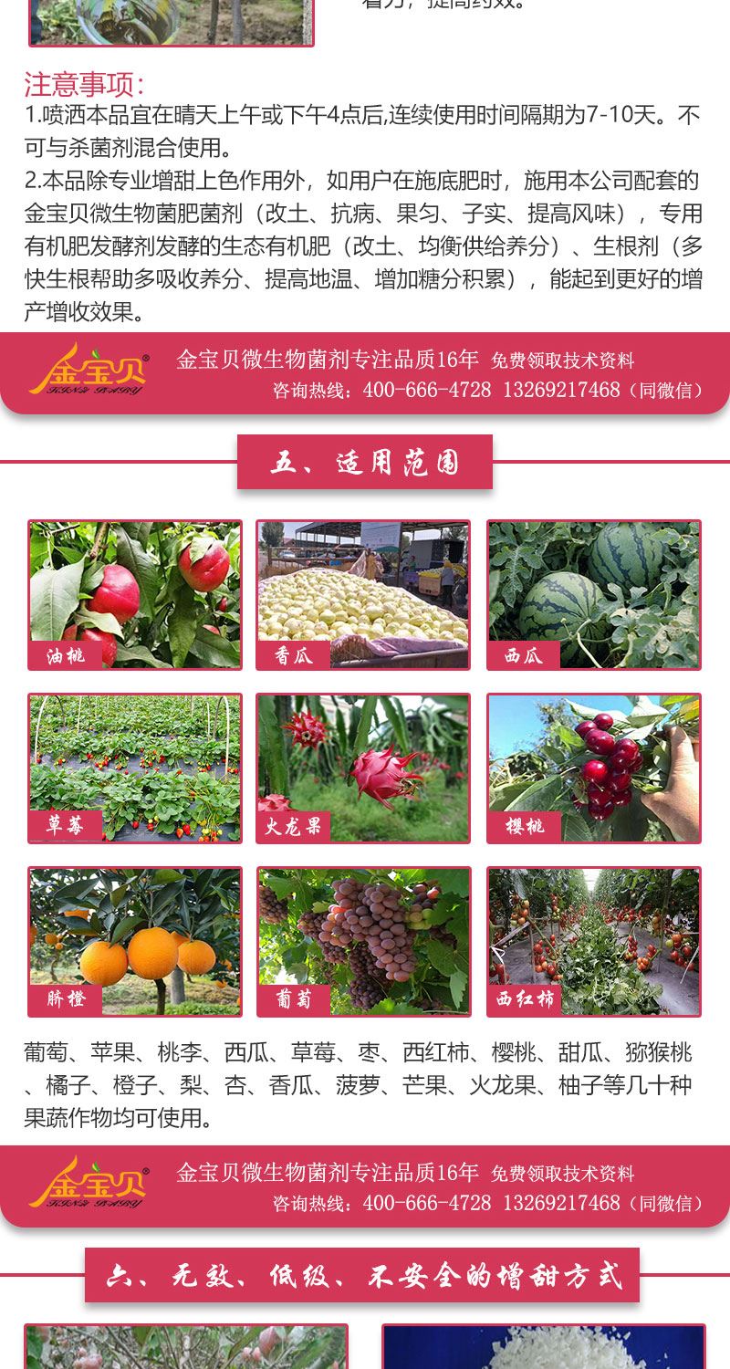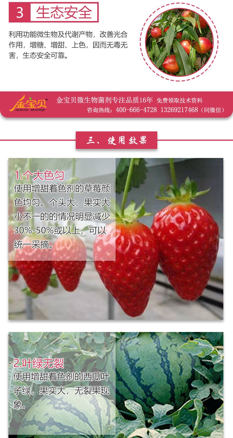 桃李瓜果不甜,少卖一半钱!种瓜人又羞又急!本品是日本高端微生物工程技术新产品, 依靠微生物改善光合作用增糖增甜,无激素,超环保安全。西瓜、葡萄、草霉、苹果、西红柿、甜瓜、枣等几十种果蔬均可,效果奇特。特征:活性因子+单糖+微肥+稀土。本品是应用日本新生物工程技术,针对外观及内在品质要求较高的一些果蔬产品如葡萄、桃、西瓜、蕃茄、梨、苹果、杏、李、枣、洋香瓜、甜瓜、草莓等专门研发配制的,使用本产品可明显克服以前使用激素及生长调节剂所带来的种种弊端。