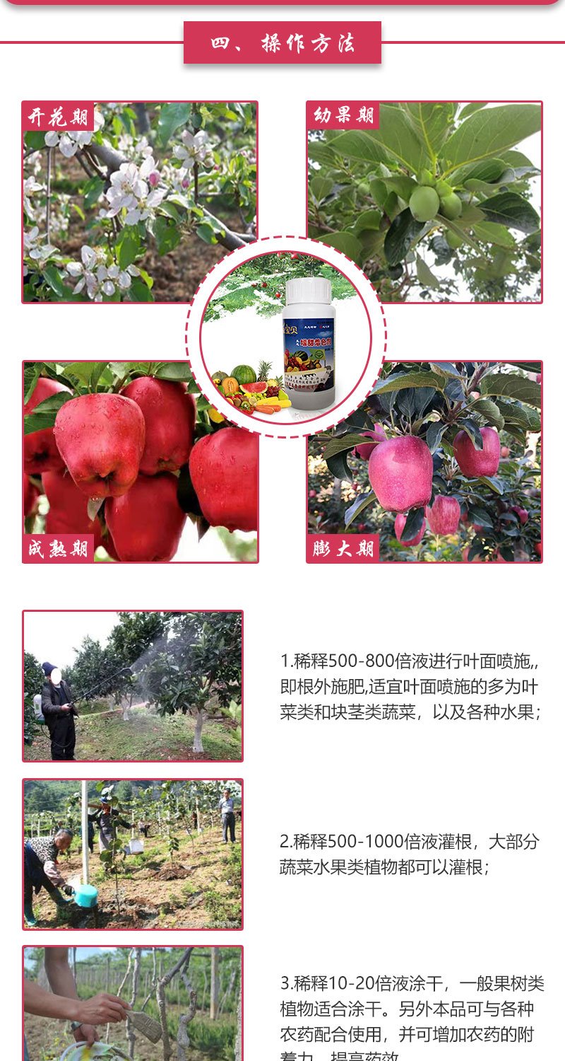 2、中后期使用:促进果实膨大,补充果实生长所需的多种微量元素,防止裂果。增加果实可溶性固形物2%,提高果实糖度0.8-1.5度,促进提前上色10-15天,色泽深且均匀。同时可增强果实硬度,延长贮存期。