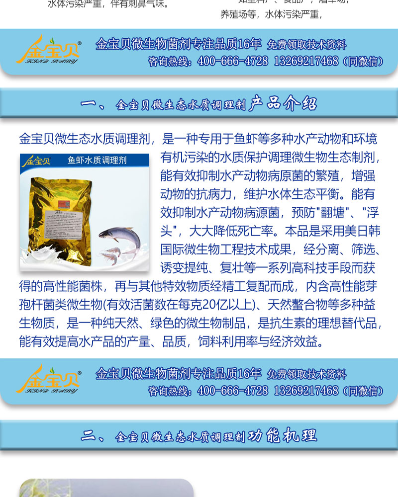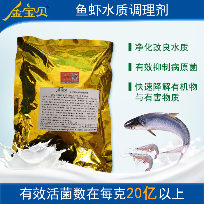 金宝贝鱼虾水产水质调理剂,是一种专用于鱼虾等多种水产动物的水质保护调理活菌剂,能有效抑制水产动物病原菌的繁殖,增强动物的抗病力,维护水体生态平衡,预防"翻塘"、"浮头",大大降低死亡率。本品是采用美日韩国际微生物工程技术成果,经分离、筛选、诱变、提纯、复壮等一系列高科技手段而获得的高性能菌株,再与其他特效物质经精工复配而成,内含高性能芽孢杆菌类微生物(有效活菌数在每克20亿以上)、天然螯合物等多种益生物质,是一种纯天然、绿色的微生物制品,是抗生素的理想替代品,能有效提高水产品的产量、品质,饲料报酬率与经济效益。
