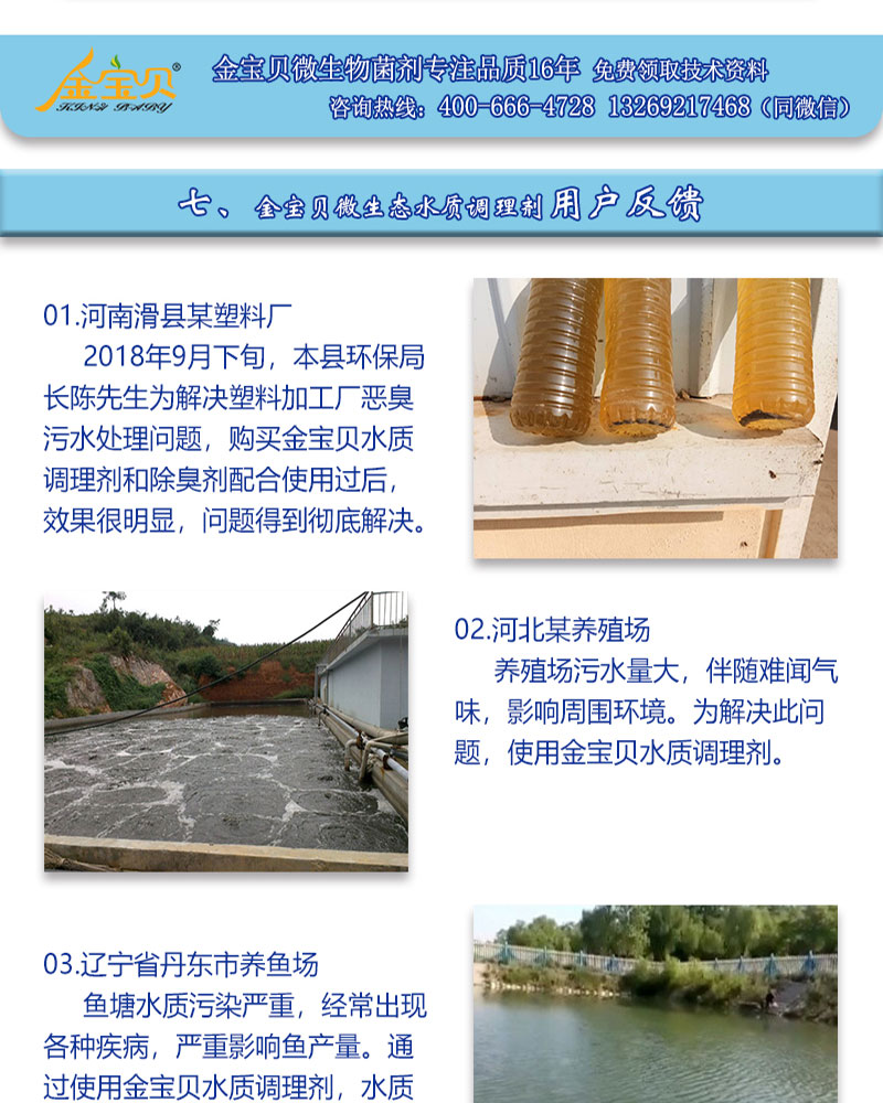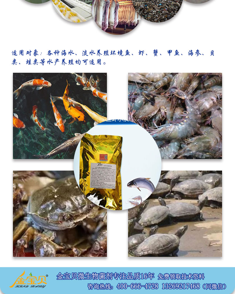 1、能快速降解有机物与有害物质。金宝贝鱼虾水质调理剂,能通过产品中功能微生物的大量繁殖与代谢产物,快速有效地降解水体中的有机物,分解铵态氮、亚硝酸盐、硫化物和磷等多种有害物质,用纯粹的微生物方式,以"命"(微生物自身生命活动)护"命"(鱼虾等健康)。