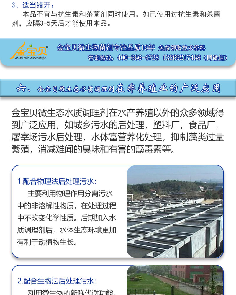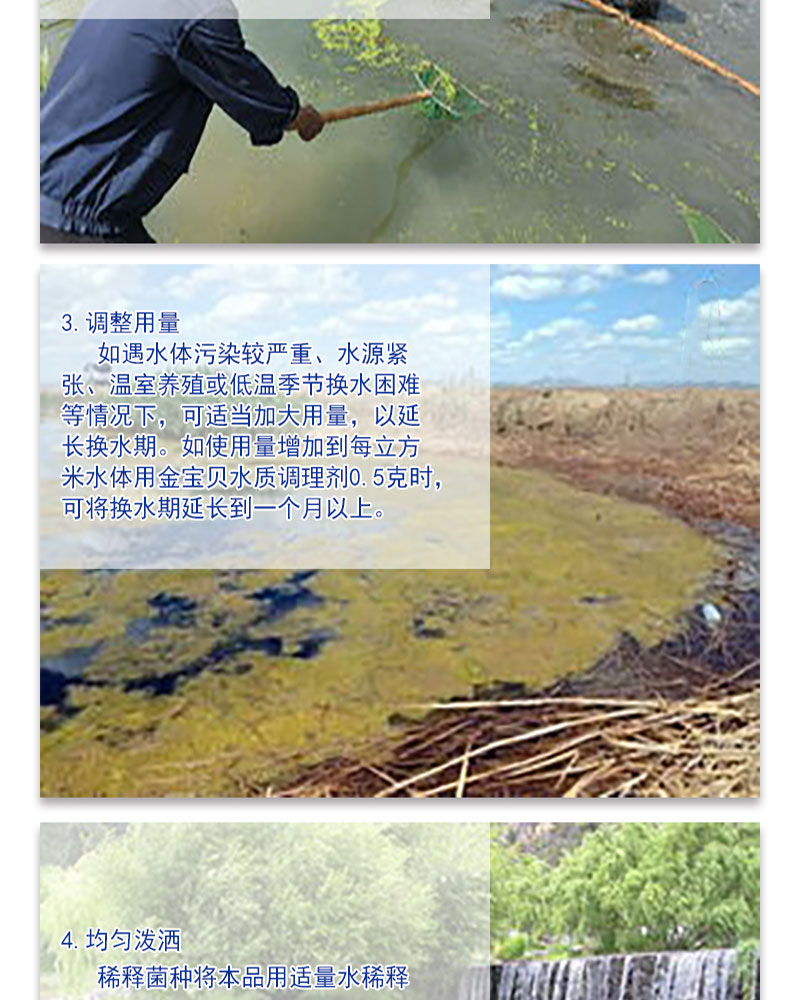 1、用量:用于养殖污水处理(污染较重)时:每立方米水体用0.5-0.6克,每20-30天用一次;用于日常水质保护时,建议每一立方米水体用0.2-0.3克,每15-20天用一次。如遇水体污染较严重、水源紧张、温室养殖或低温季节换水困难等情况下,可适当加大用量,以延长换水期。如使用量增加到每立方米水体用金宝贝水质调理剂0.5克时,可将换水期延长到一个月以上。
