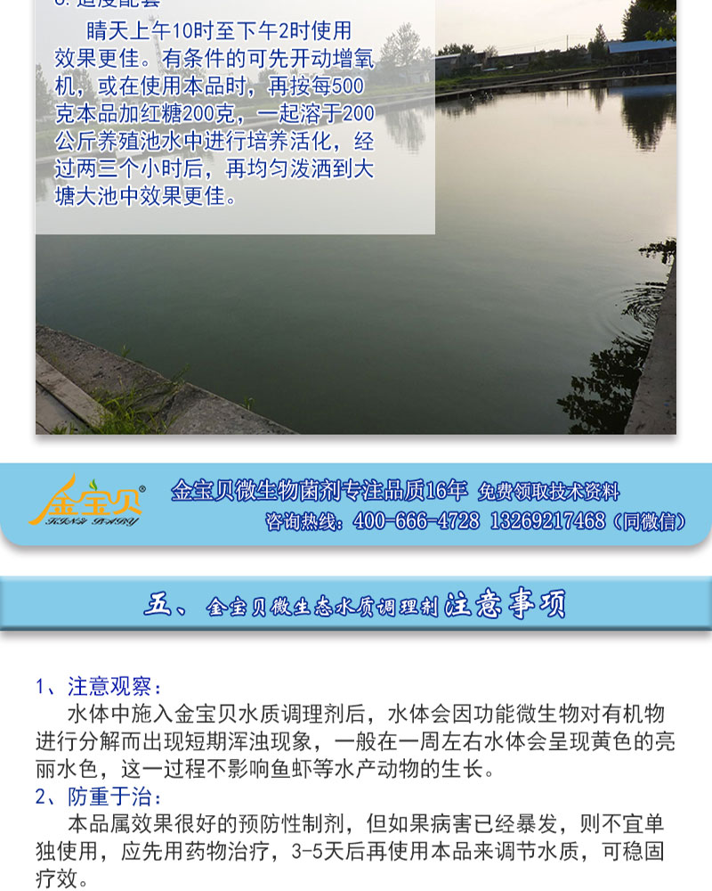 4、时段:睛天上午10时至下午2时使用效果更佳。有条件的可先开动增氧机,或在使用本品时,再按每500克本品加红糖200克,一起溶于200公斤养殖池水中进行培养活化,经过两三个小时后,再均匀泼洒到大塘大池中效果更佳。