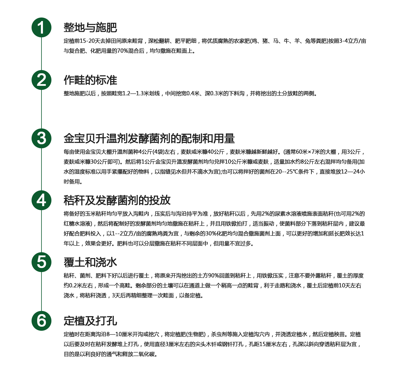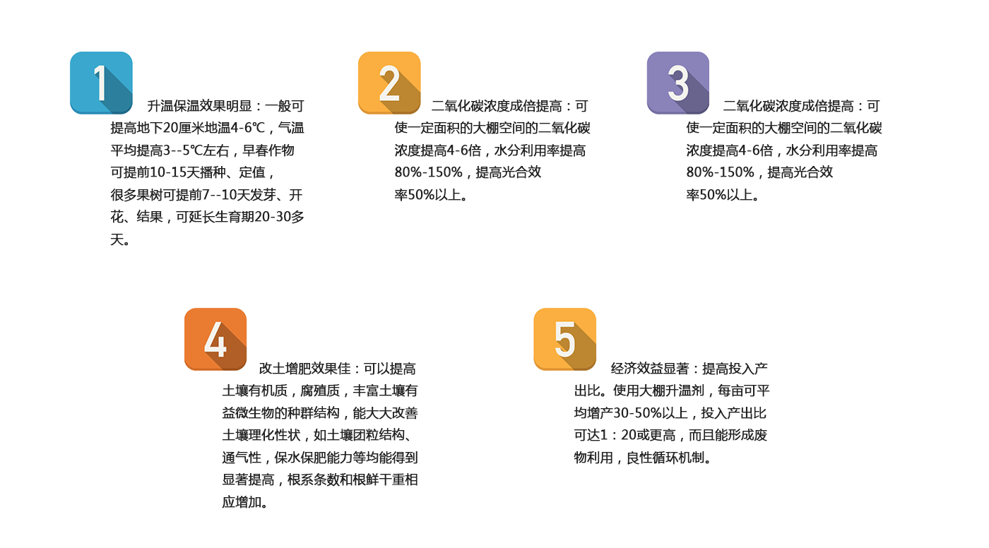 秸秆物料中加入金宝贝升温发酵助剂后,功能微生物大量和快速繁殖,微生物在发酵分解过程中能产生大量的热量、二氧 化碳、酶、及其他多种代谢产物。二氧化碳供应充足,气温、地温大幅度提高,有助于作物在低温等不利环境条件下顺利 生长发育;有益微生物大量繁殖,生化反应过程中形成的多种酶及其他抗病因子,使作物抗病能力大大增强,能节省七成以 上的农药成本;秸秆腐熟后产生大量的有机、无机养分,微量元素,使土壤营养丰富、肥沃,因而使作物生长健壮,可节省一 半以上的化肥用量;由于化肥、农药使用量大大减少,因而可显著提高果蔬品质,外观和口味都有明显改善,卖价好,商品 率高,经济效益显著。